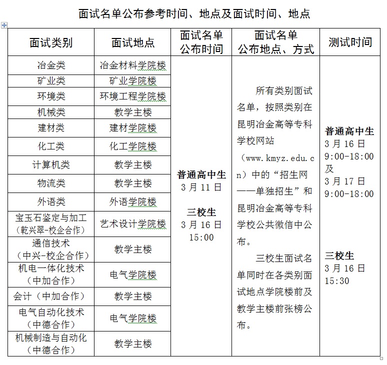 (二)面試地點:昆明冶金高等??茖W(xué)校安寧校區(qū)(詳見上表“面試名單公布參考時間、地點及面試時間、地點”)。