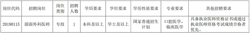 因工作需要,經(jīng)醫(yī)院研究同意在大理大學(xué)第一附屬醫(yī)院2019年公開招聘(第二批)編制外工作人員崗位計(jì)劃中增加“頜面外科醫(yī)師”崗位計(jì)劃1名,現(xiàn)補(bǔ)發(fā)公告,具體招聘崗位及條件如下: