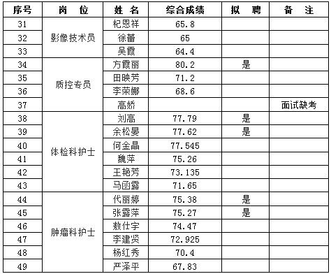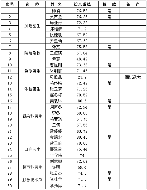 根據(jù)《云南昆鋼醫(yī)院2019年工作人員(非事業(yè)編制)招聘啟事》的相關(guān)安排,經(jīng)過現(xiàn)場(chǎng)報(bào)名、資格審查、筆試、面試、體檢等程序,經(jīng)醫(yī)院招聘人員工作領(lǐng)導(dǎo)小組辦公室審批,現(xiàn)將綜合成績(jī)和擬聘名單公示如下: