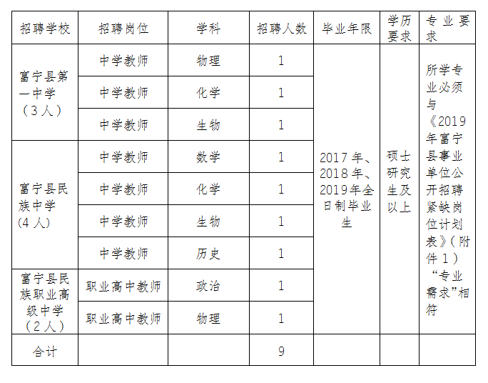 2.所學(xué)專業(yè)必須與報(bào)考學(xué)科專業(yè)要求相符(具體參照《2019年富寧縣事業(yè)單位公開(kāi)招聘緊缺崗位計(jì)劃表》(附件1)“專業(yè)需求”欄)。