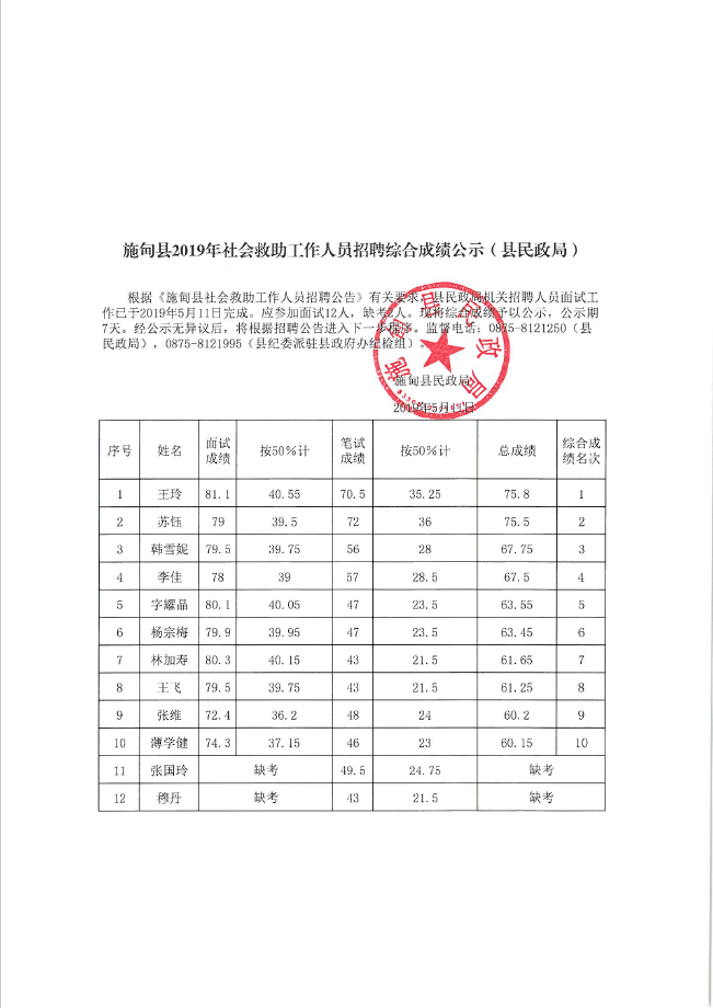 施甸縣2019年社會救助工作人員招聘綜合成績公示(縣民政局)