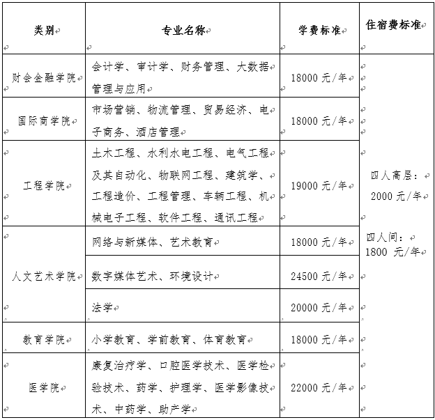 | 財會金融學院 | 財務管理、會計、證券與期貨、投資與理財 | 10000/年 | 四人高層: 2000元/年 四人間: 1800 元/年 八人間: 600 元/年 |