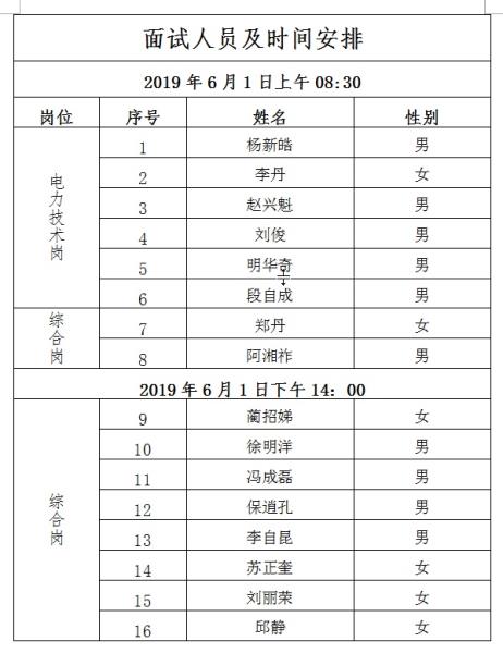根據(jù)《德宏戶宋河發(fā)電有限責(zé)任公司2019年招聘公告》《德宏戶宋河發(fā)電有限責(zé)任公司2019年招聘筆試通知》,2019年5月26日,德宏戶宋河發(fā)電有限責(zé)任公司委托第三方組織了筆試考試,根據(jù)筆試成績排名,現(xiàn)將進(jìn)入面試人員名單通知如下: