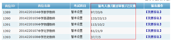 回復(fù):您好!直接在報(bào)名系統(tǒng)中查看。在報(bào)名期間,進(jìn)入各報(bào)名崗位即可看到該崗位當(dāng)前報(bào)名情況,報(bào)名情況顯示為報(bào)名人數(shù)、通過審核人數(shù)、交費(fèi)人數(shù)三個數(shù)字,報(bào)名情況數(shù)據(jù)動態(tài)顯示,可手動刷新頁面,即時顯示當(dāng)前最新數(shù)據(jù)。交費(fèi)人數(shù)為最終有效報(bào)名人數(shù)。