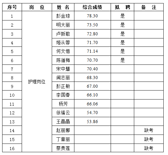 根據(jù)《云南昆鋼醫(yī)院2019年工作人員(非事業(yè)編制)招聘啟事》的相關(guān)安排,經(jīng)過現(xiàn)場(chǎng)報(bào)名、資格審查、筆試、面試、體檢等程序,經(jīng)醫(yī)院招聘人員工作領(lǐng)導(dǎo)小組辦公室審批,現(xiàn)將綜合成績(jī)和擬聘名單公示如下: