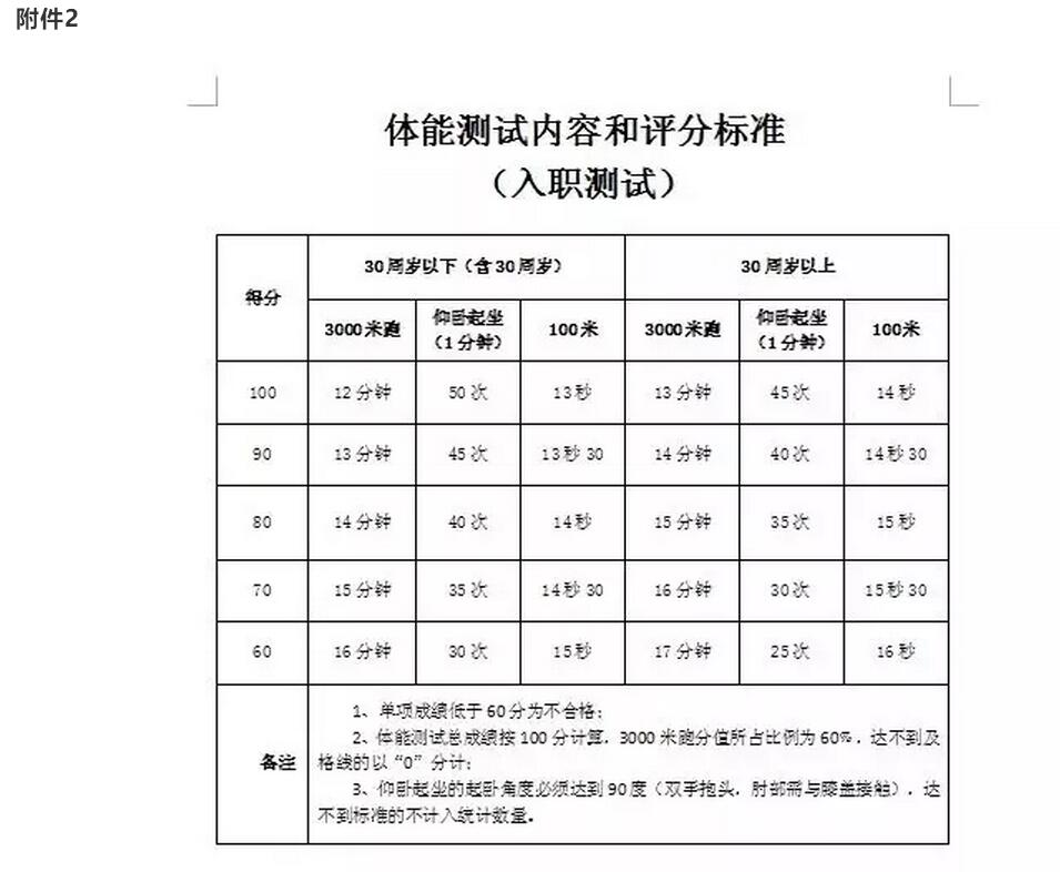(2)體能測(cè)試成績(jī)?yōu)?00分,測(cè)試科目為100米跑、3000米跑、俯臥撐。3000米跑為必測(cè)科目,所占分值為60分;其它兩項(xiàng)任選一項(xiàng),所占分值為40分,考核達(dá)標(biāo)標(biāo)準(zhǔn)見(jiàn)附件2。
