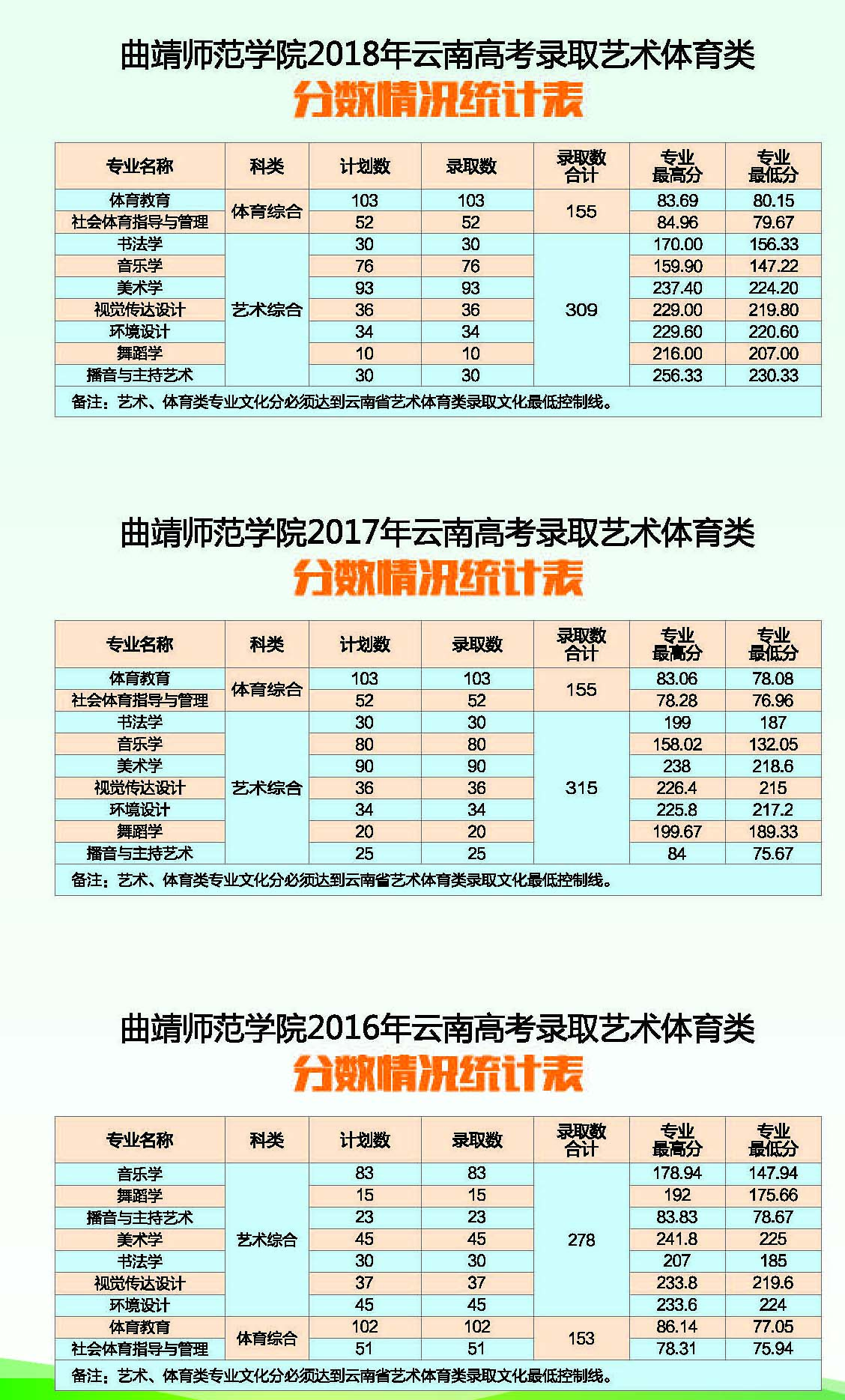 曲靖師范學院2016-2018年云南高考錄取藝術體育類分數(shù)情況統(tǒng)計表