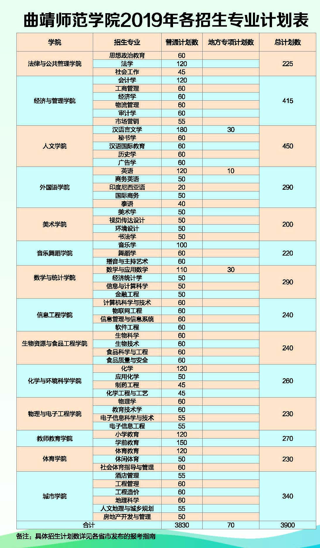 曲靖師范學(xué)院2019年各招生專業(yè)計(jì)劃表