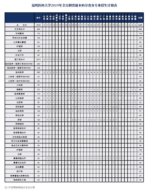 昆明醫(yī)科大學(xué)2019年全日制普通本科分省各專業(yè)招生計劃表