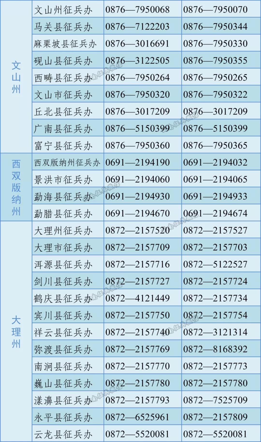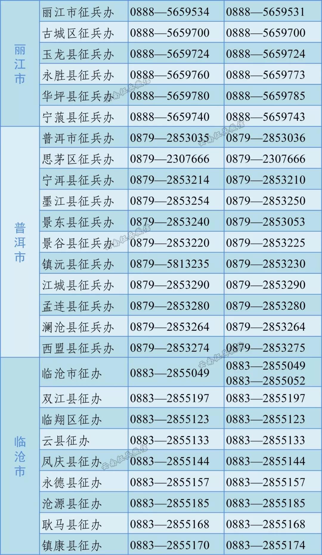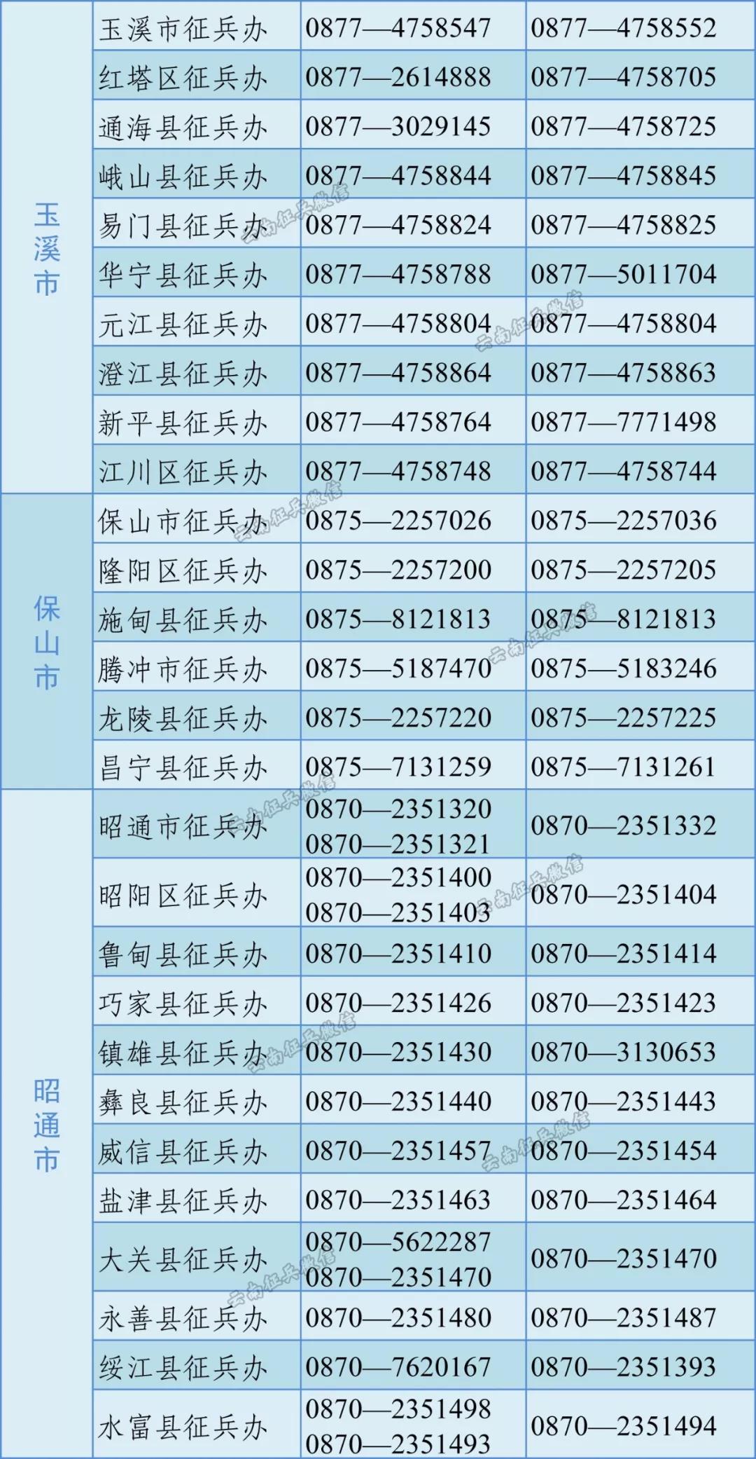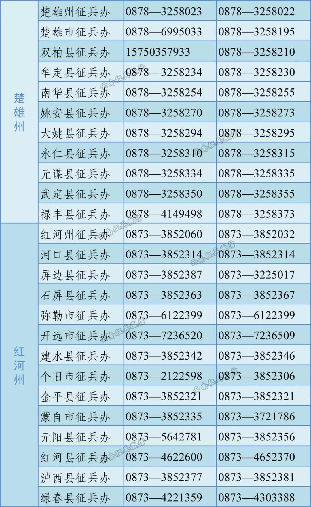 為方便適齡青年積極報名應征和咨詢,接受社會各界對征兵工作的監(jiān)督,現(xiàn)將云南省各級兵役機關(guān)值班及舉報電話公布如下。