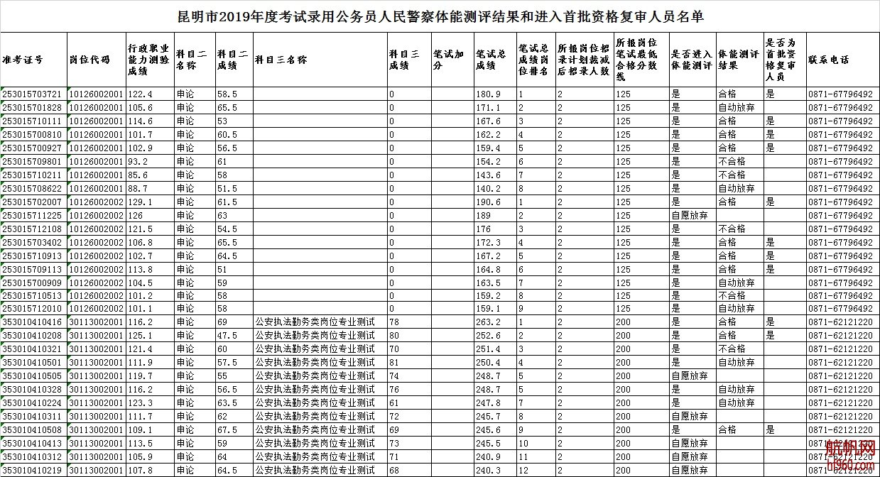 昆明市2019年考錄人民警察體能測(cè)評(píng)結(jié)果和進(jìn)入首批資格復(fù)審人員名單