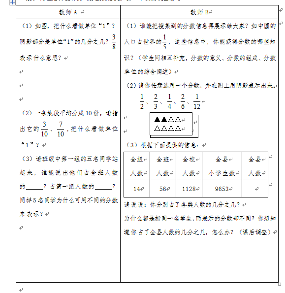 表:兩位老師設計的《分數(shù)的意義》第一節(jié)課的鞏固練習