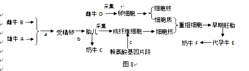 30. 圖8是吉林大學(xué)農(nóng)學(xué)院奶牛繁育基地成功培育攜帶外源賴氨酸基因的克隆奶牛的過程示意圖,請(qǐng)據(jù)圖回答(1)~(5)。