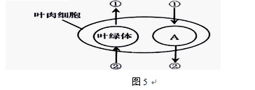 27. 圖5為葉片葉肉細(xì)胞內(nèi)進(jìn)行的某些生理活動(dòng)示意圖,其中①、②為相關(guān)氣體,A為細(xì)胞內(nèi)相關(guān)結(jié)構(gòu)。請(qǐng)分析回答