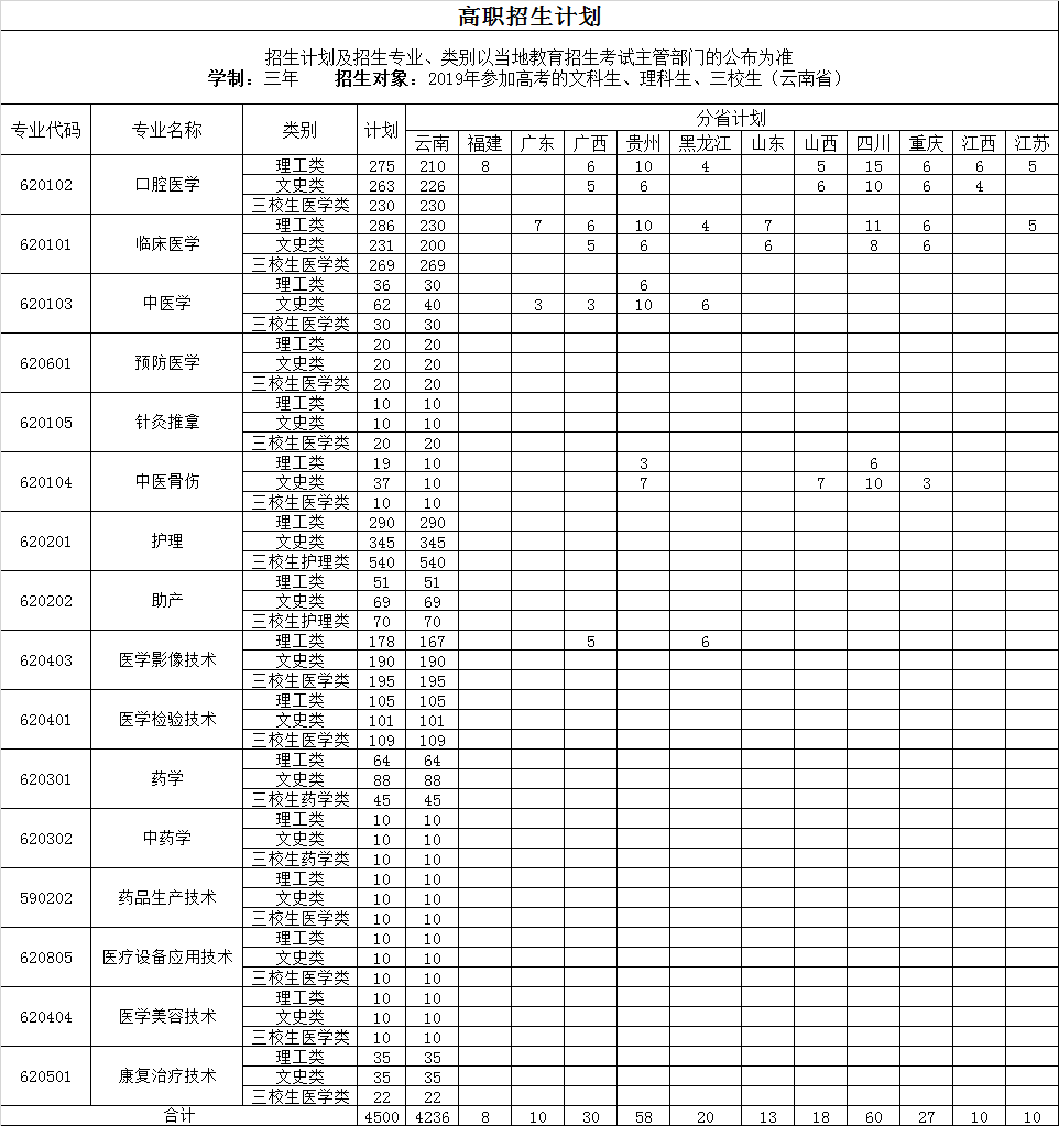 2019年昆明衛(wèi)生職業(yè)學(xué)院高職專科分省招生計劃