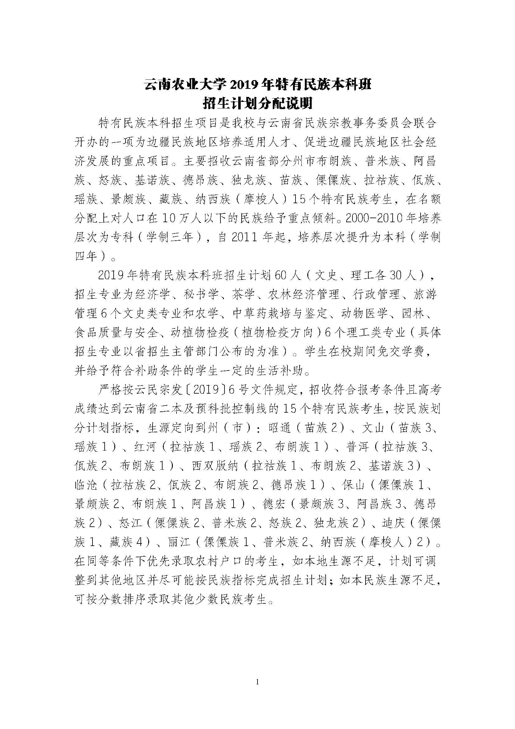 云南農(nóng)業(yè)大學(xué)2019年特有民族本科班趙申計劃分配說明