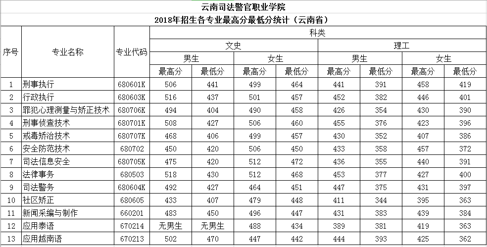 云南司法警官職業(yè)學院2018年招生各專業(yè)最高分最低分統(tǒng)計(云南省)