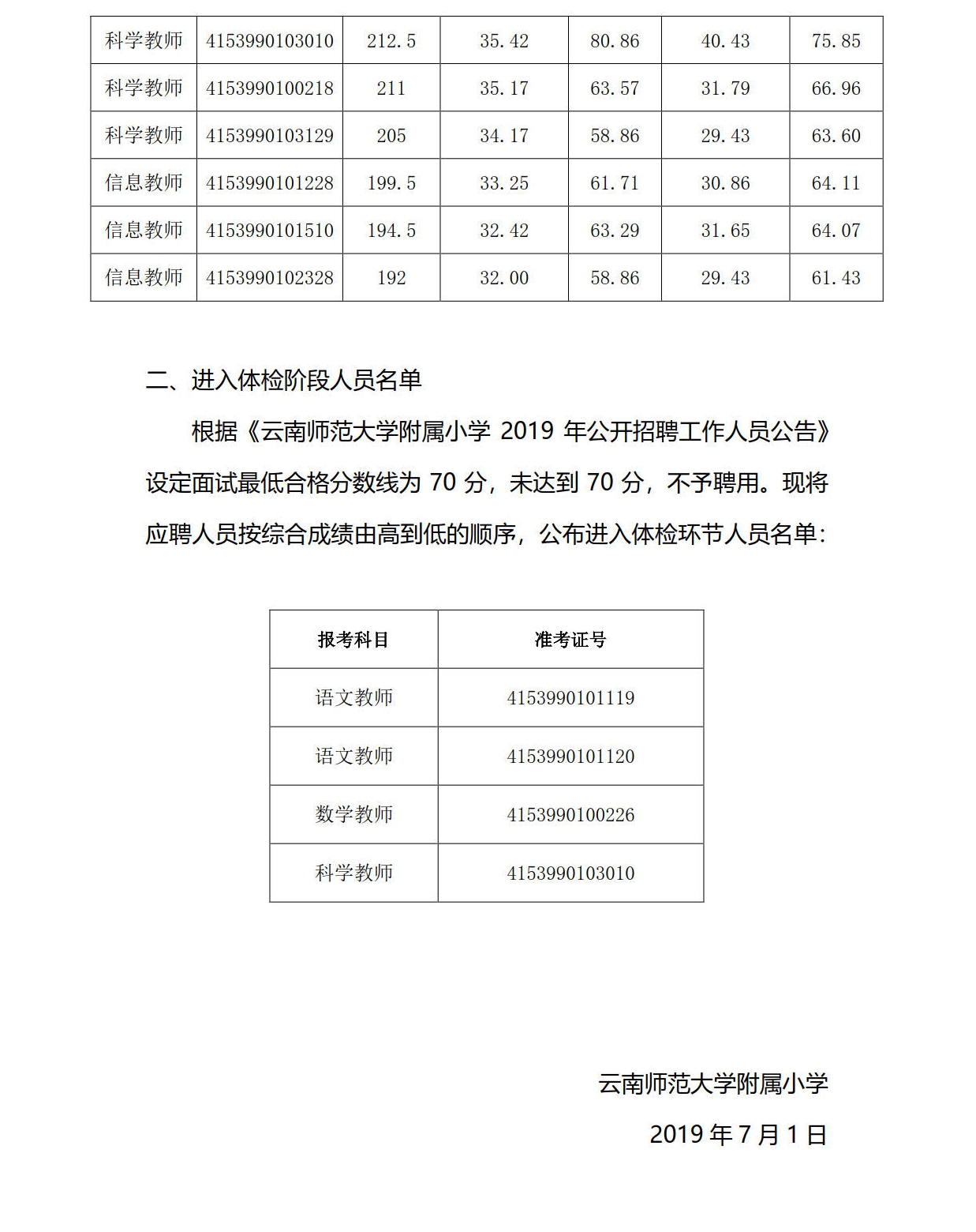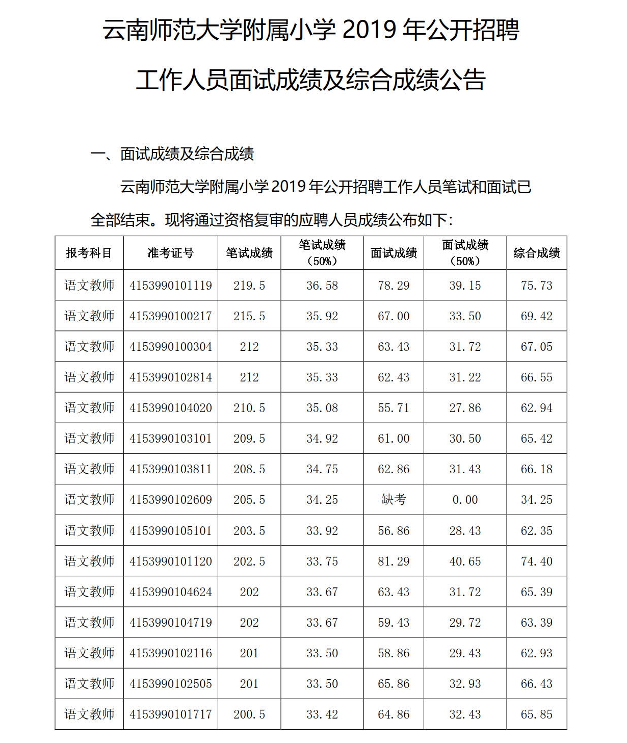 云南師范大學(xué)附屬小學(xué)2019年招聘面試成績(jī)及綜合成績(jī)公告