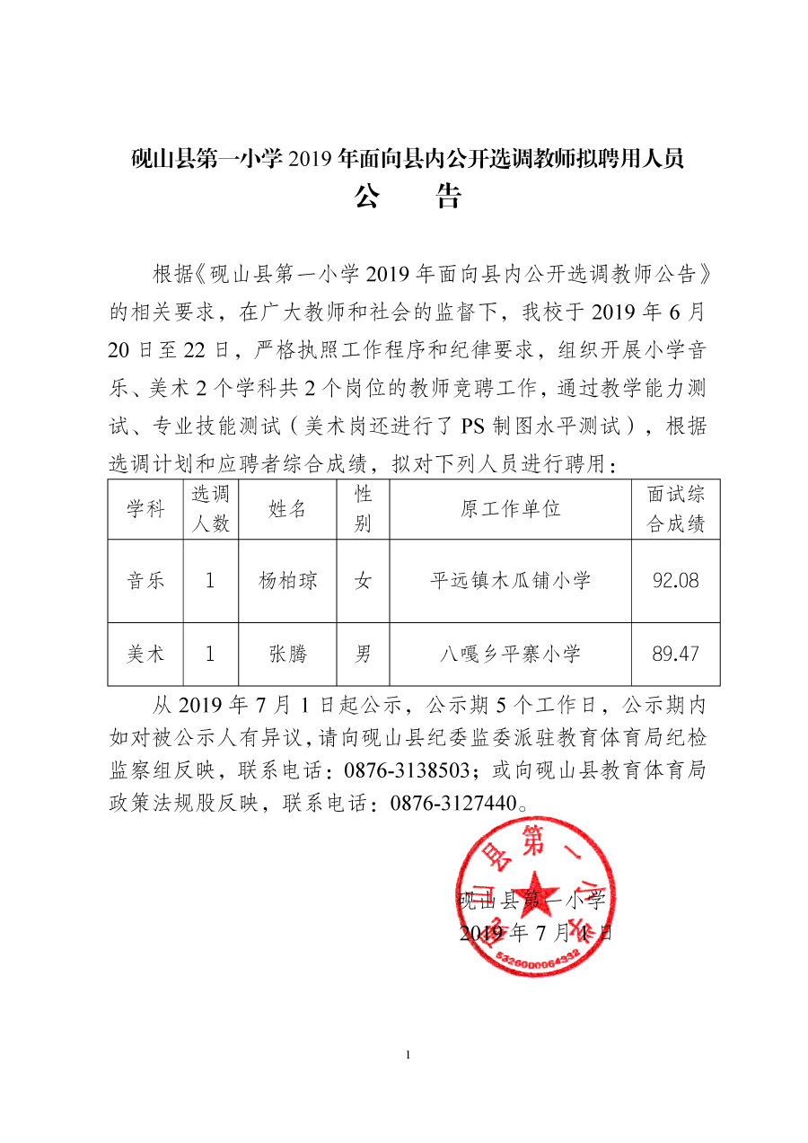文山州硯山縣第一小學(xué)2019年選調(diào)教師擬聘用人員公告