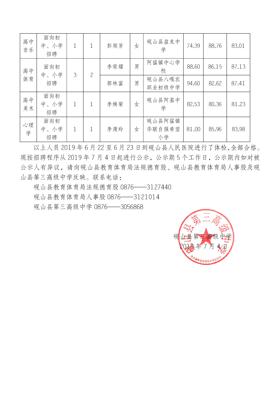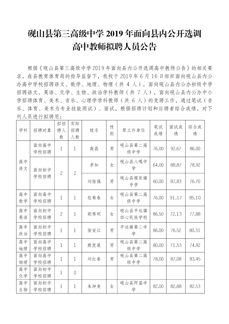 2019年文山州硯山縣第三高級(jí)中學(xué)選調(diào)高中教師擬聘人員公告