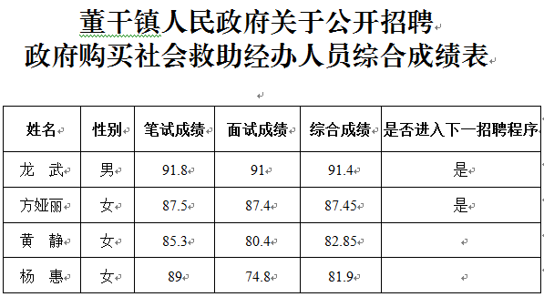 董干鎮(zhèn)人民政府關(guān)于公開(kāi)招聘政府購(gòu)買(mǎi)社會(huì)救助經(jīng)辦人員綜合成績(jī)公告