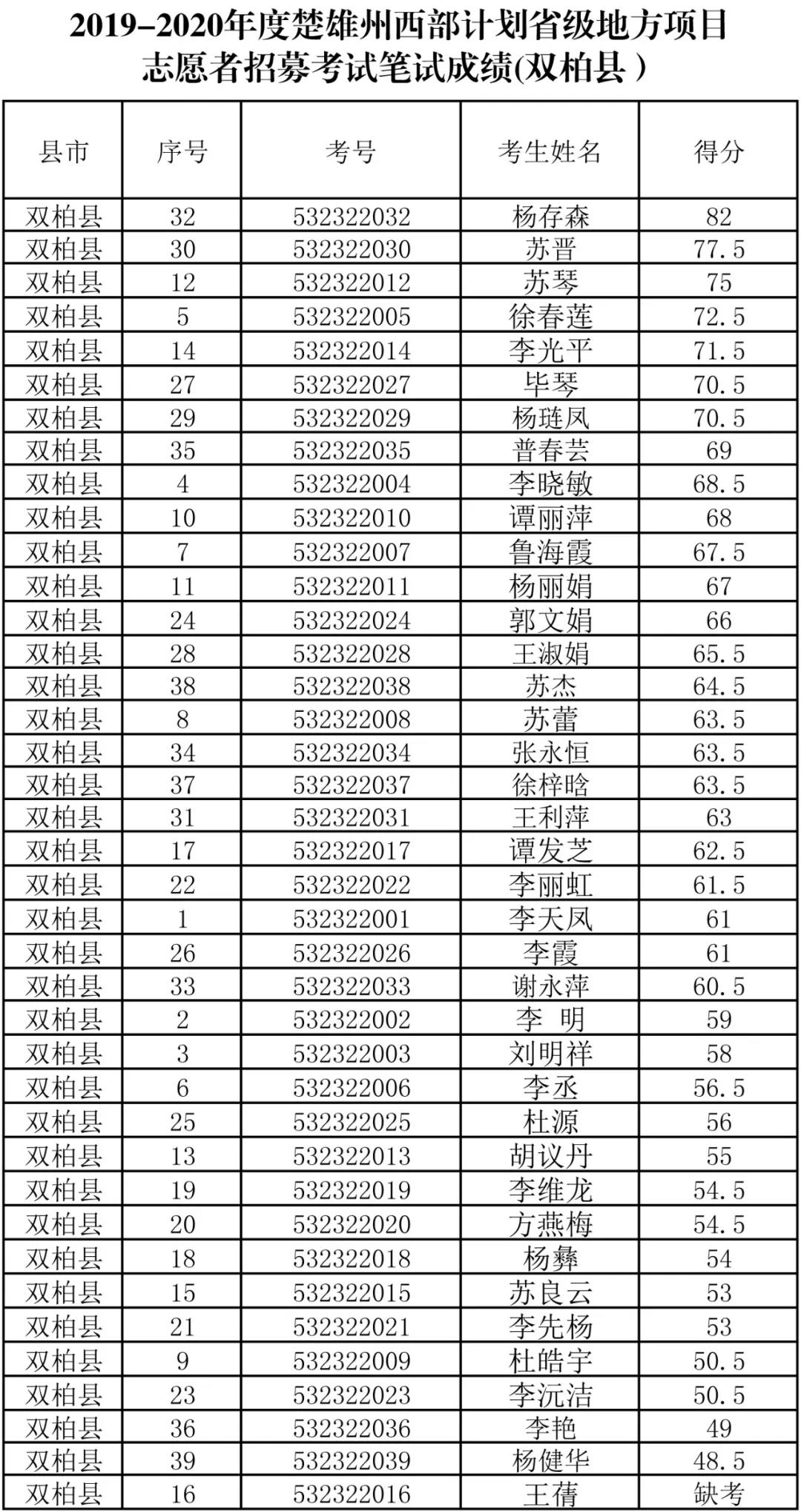 根據(jù)云南省大學(xué)生志愿服務(wù)西部計(jì)劃項(xiàng)目管理辦公室《關(guān)于開展2019—2020年度云南省大學(xué)生志愿服務(wù)西部計(jì)劃省級地方項(xiàng)目的通知》要求,楚雄州于2019年7月1日組織筆試。全州通過報(bào)名資格審核549人,實(shí)際參加筆試499人。筆試由楚雄州大學(xué)生志愿服務(wù)西部計(jì)劃項(xiàng)目管理辦公室統(tǒng)一組織命題、統(tǒng)一閱卷。閱卷工作已完成,現(xiàn)對筆試成績予以公示。
