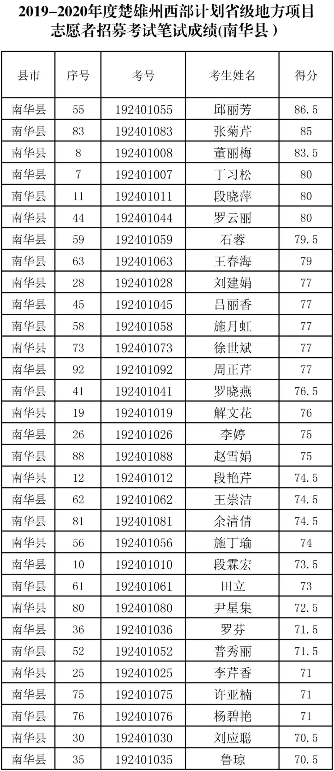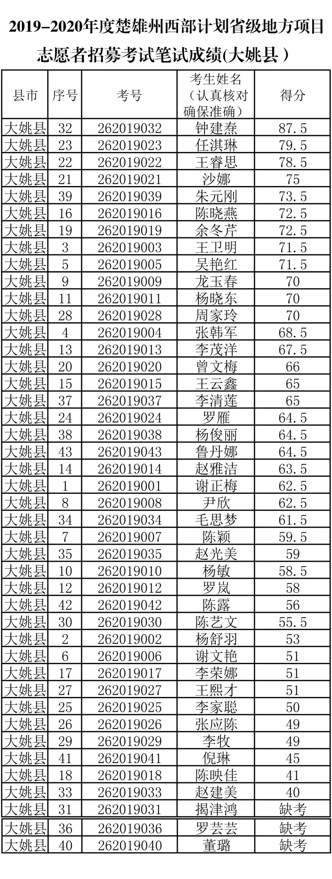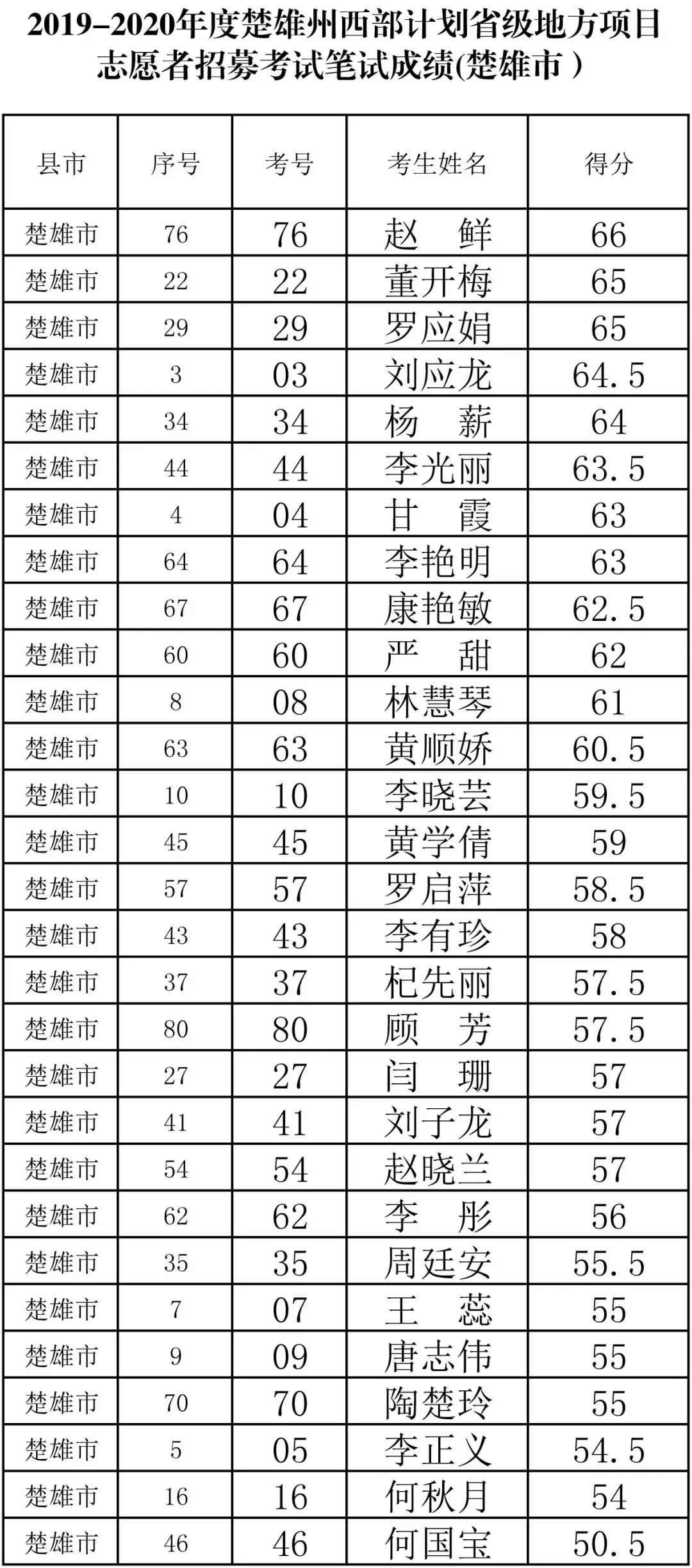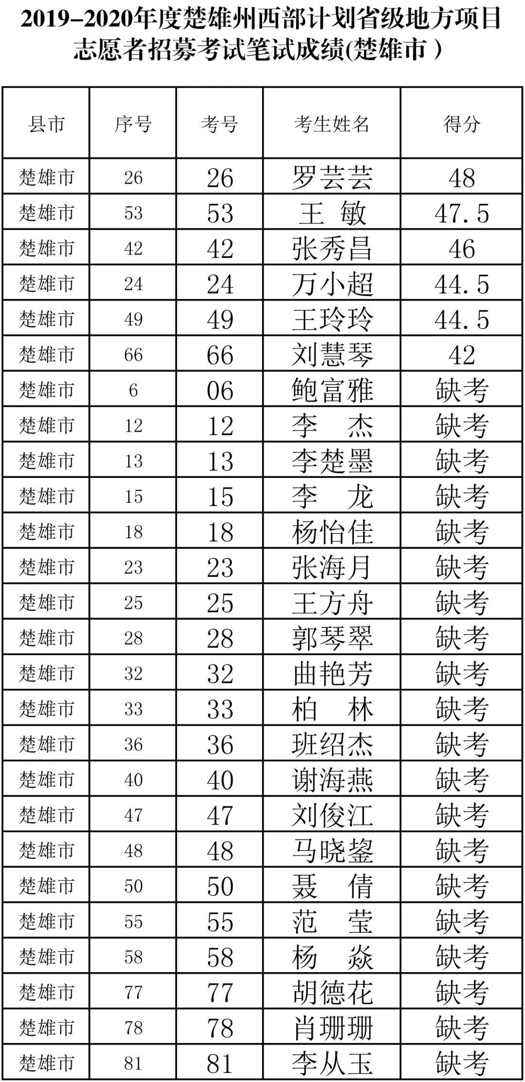 楚雄州2019-2020年度西部計(jì)劃省級地方項(xiàng)目志愿者筆試成績公示