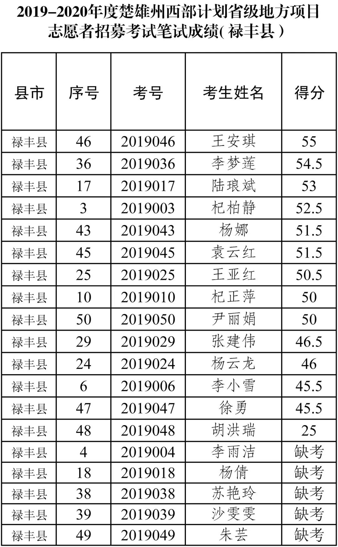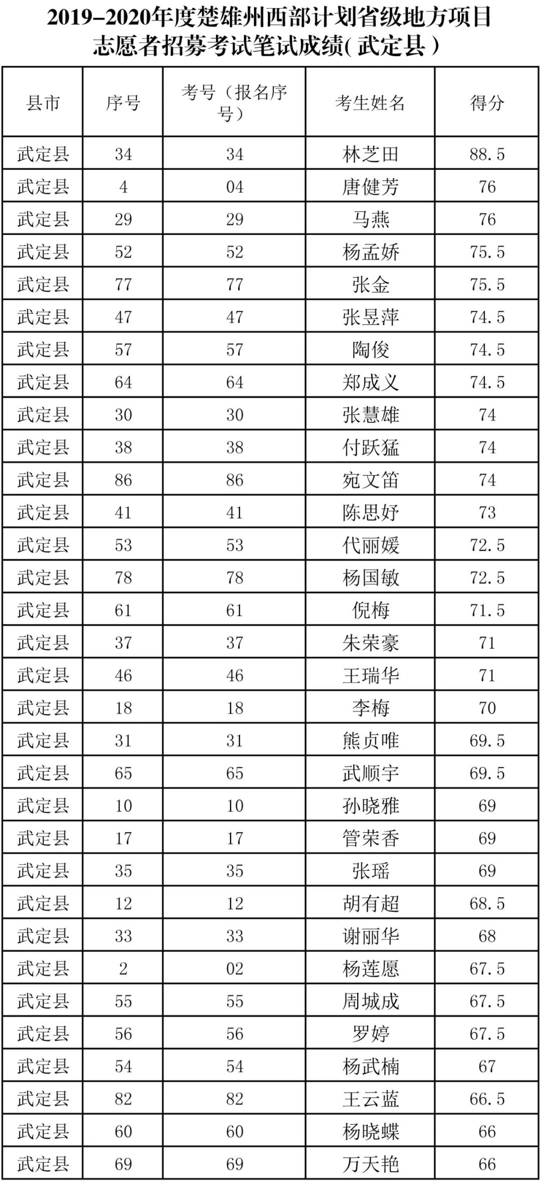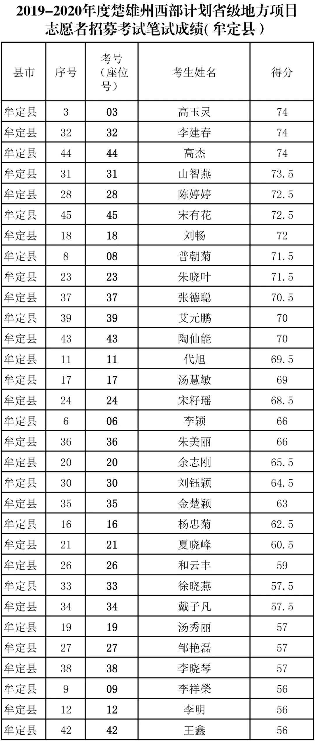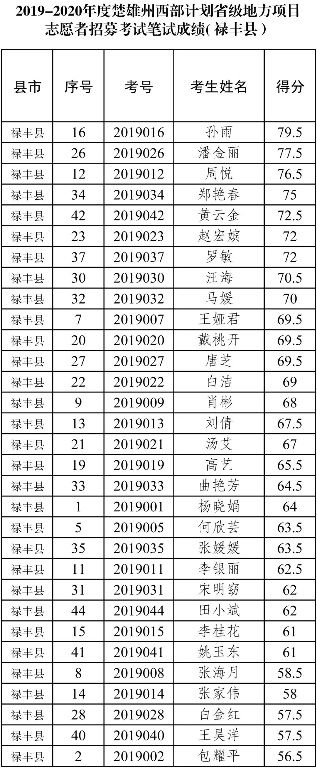 楚雄州2019-2020年度西部計(jì)劃省級地方項(xiàng)目志愿者筆試成績公示