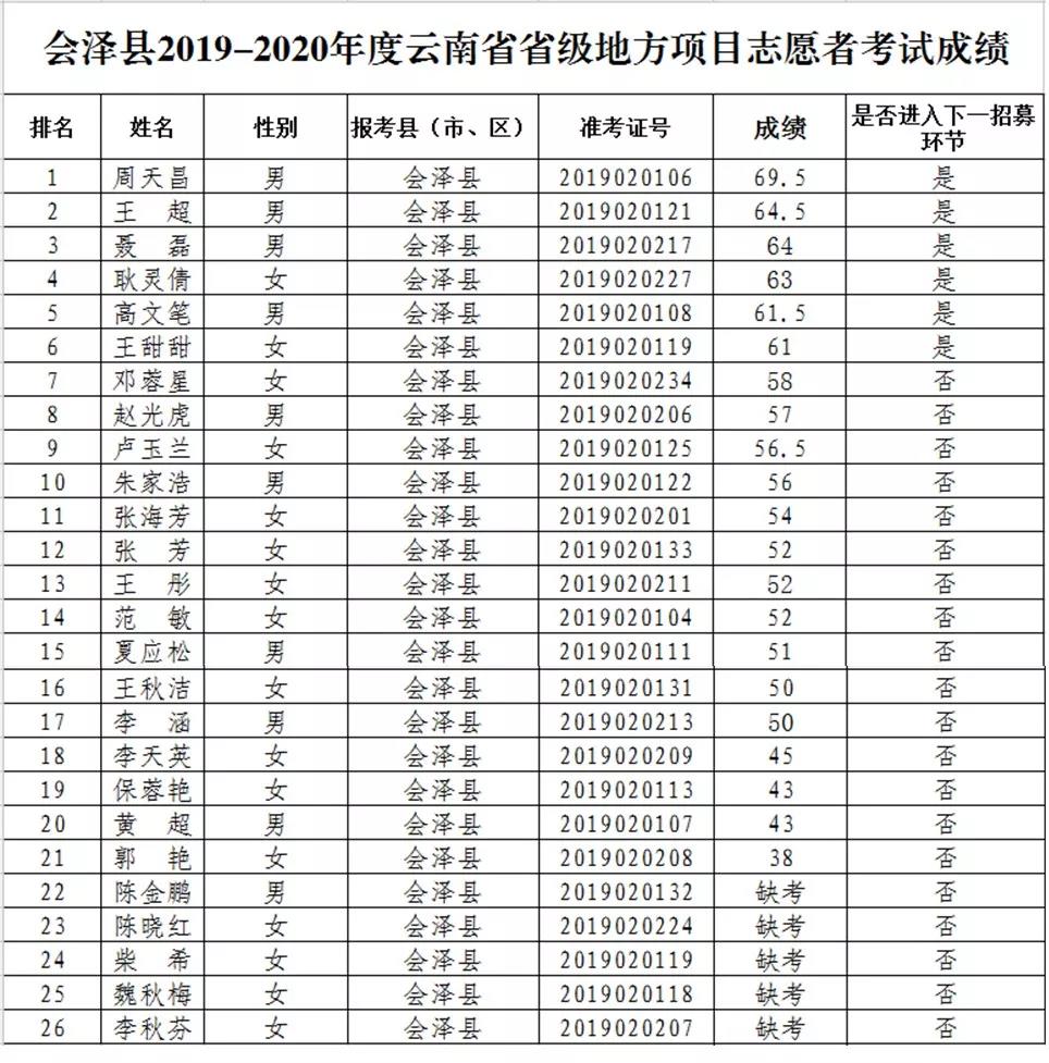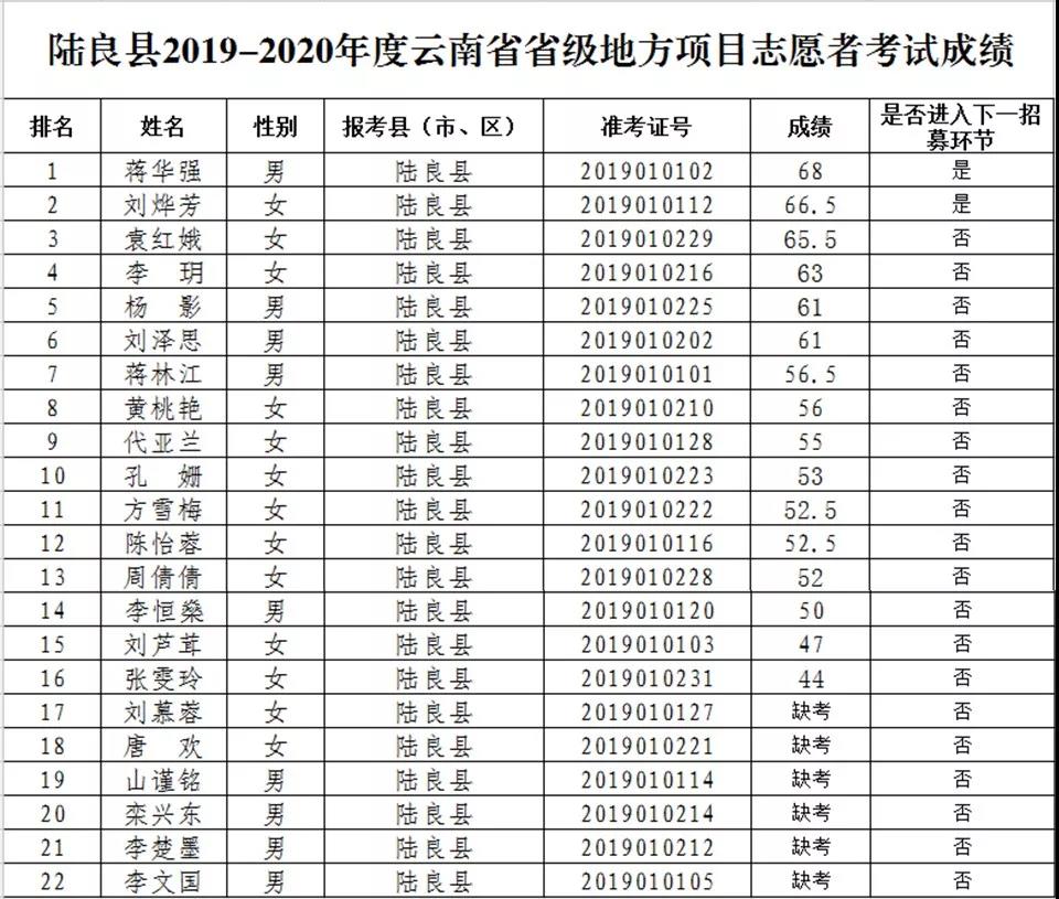 根據(jù)《共青團(tuán)云南省委 云南省教育廳 云南省財(cái)政廳 云南省人力資源和社會(huì)保障廳轉(zhuǎn)發(fā)<關(guān)于進(jìn)一步加強(qiáng)云南省大學(xué)生志愿服務(wù)西部計(jì)劃工作的意見>的通知》(云青聯(lián)〔2016〕11號(hào))和《關(guān)于印發(fā)《2019—2020年度大學(xué)生志愿服務(wù)西部計(jì)劃云南省實(shí)施方案》的通知》(云志項(xiàng)辦通〔2019〕4號(hào))等文件精神及曲靖2019-2020年度大學(xué)生志愿服務(wù)西部計(jì)劃省級(jí)地方項(xiàng)目志愿者招募程序,本次筆試報(bào)考人數(shù)為68人,應(yīng)試54人,缺考14人,現(xiàn)將筆試成績(jī)及面試相關(guān)事項(xiàng)公告如下: