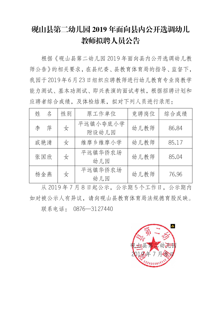 硯山縣第二幼兒園2019年面向縣內(nèi)公開選調(diào)幼兒教師擬聘人員公告