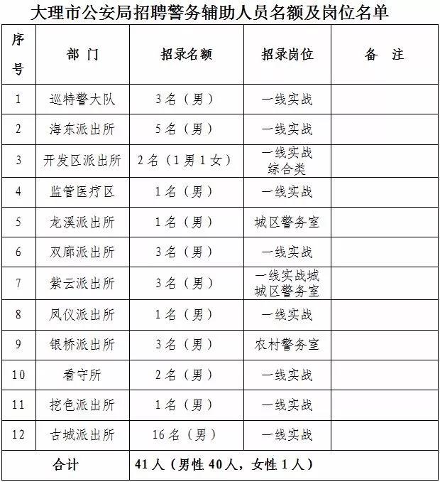 附:大理市公安局招聘警務輔助人員名額及崗位名單