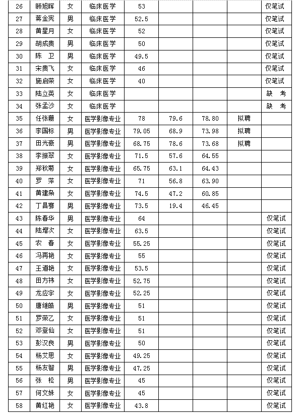 根據(jù)《麻栗坡縣人民醫(yī)院2019年公開招聘編外衛(wèi)生專業(yè)技術(shù)人員公告》,現(xiàn)將考試成績及擬聘人員名單公示如下: