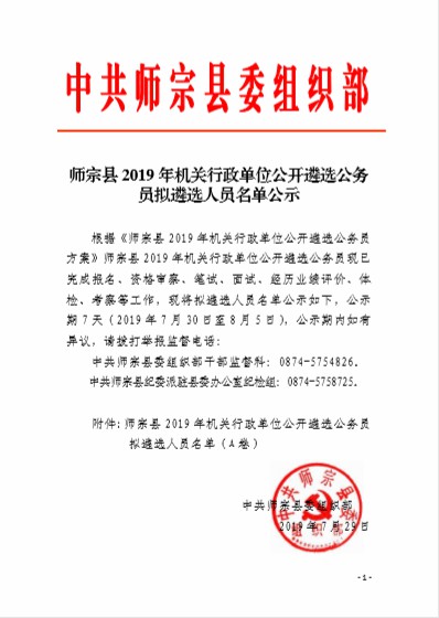 師宗縣2019 年機(jī)關(guān)行政單位公開遴選公務(wù)員擬遴選人員名單公示