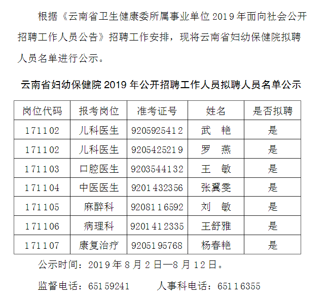 云南省婦幼保健院2019年面向社會(huì)公開(kāi)招聘事業(yè)編制工作人員擬聘人員名單公示