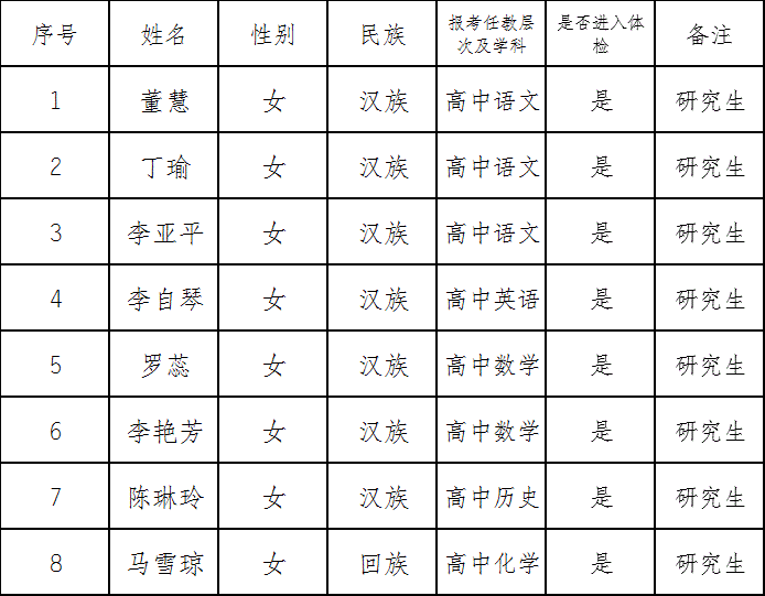 根據(jù)《曲靖市沾益區(qū)教育體育局所屬中學(xué)2019年公開招聘教師實施方案公告》的相關(guān)規(guī)定,現(xiàn)將曲靖市沾益區(qū)教育體育局所屬中學(xué)2019年公開招聘教師擬進(jìn)入體檢人員名單公告如下: