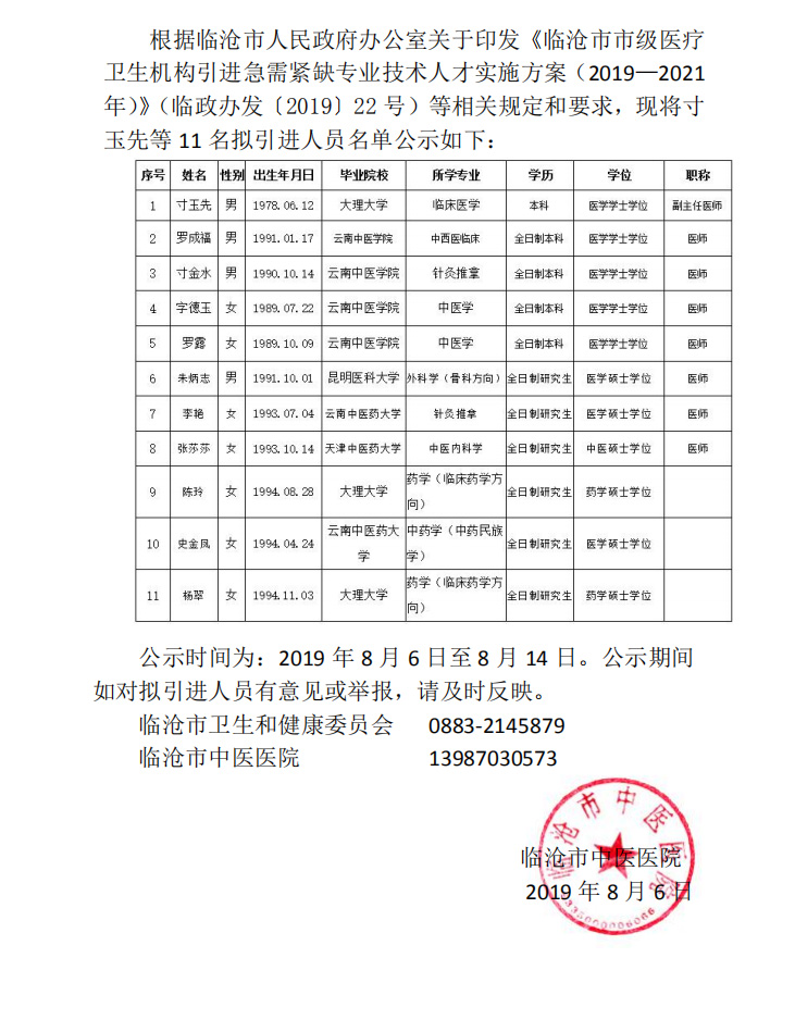 臨滄市中醫(yī)醫(yī)院2019年引進(jìn)緊缺崗位專業(yè)技術(shù)人才招聘結(jié)果的公示