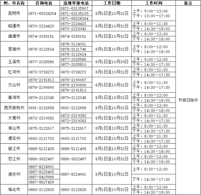 云南省2019年中等職業(yè)學(xué)校招生錄取期間各州、市咨詢及違規(guī)舉報(bào)聯(lián)系方式