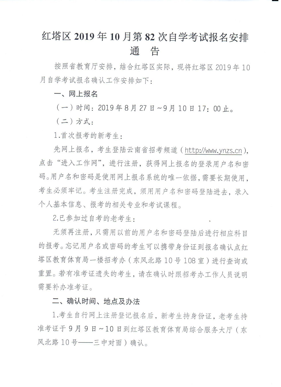 玉溪市紅塔區(qū)2019年10月第82次自學(xué)考試報(bào)名安排通告
