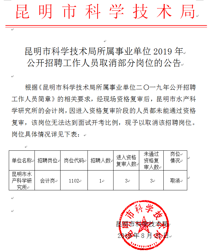 昆明市科學(xué)技術(shù)局2019年招聘取消部分崗位的公告