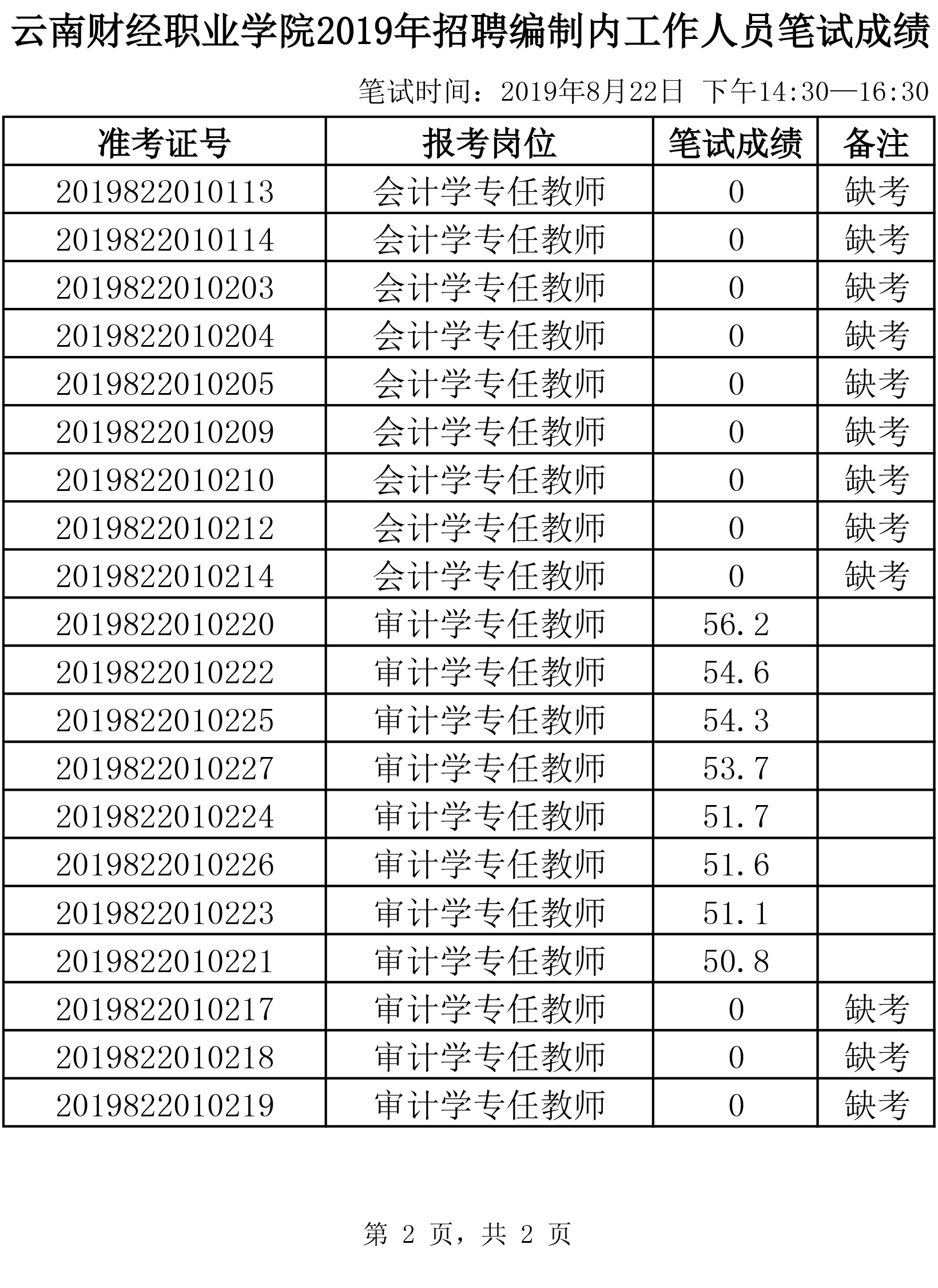 云南財(cái)經(jīng)職業(yè)學(xué)院2019年招聘筆試成績(jī)公示