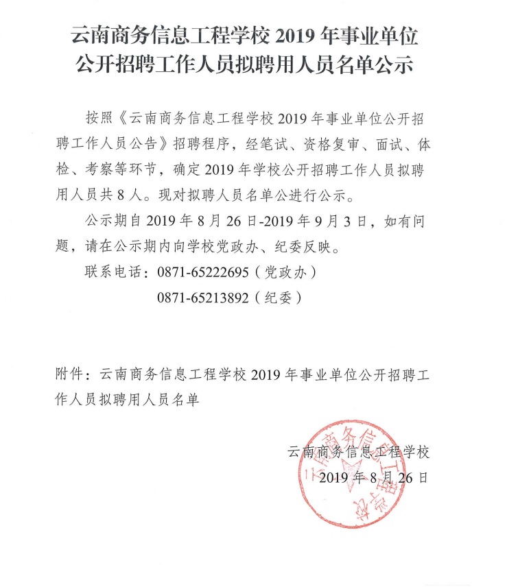 云南商務信息工程學校2019年事業(yè)單位公開招聘工作人員擬聘用人員名單公示