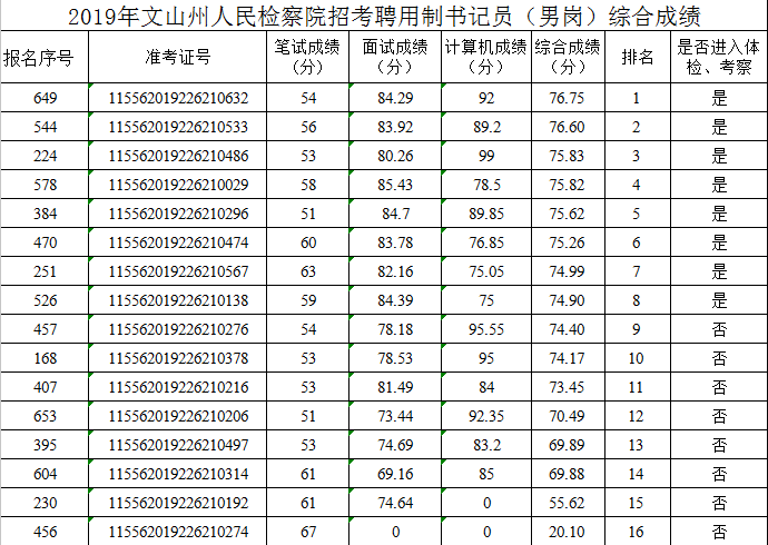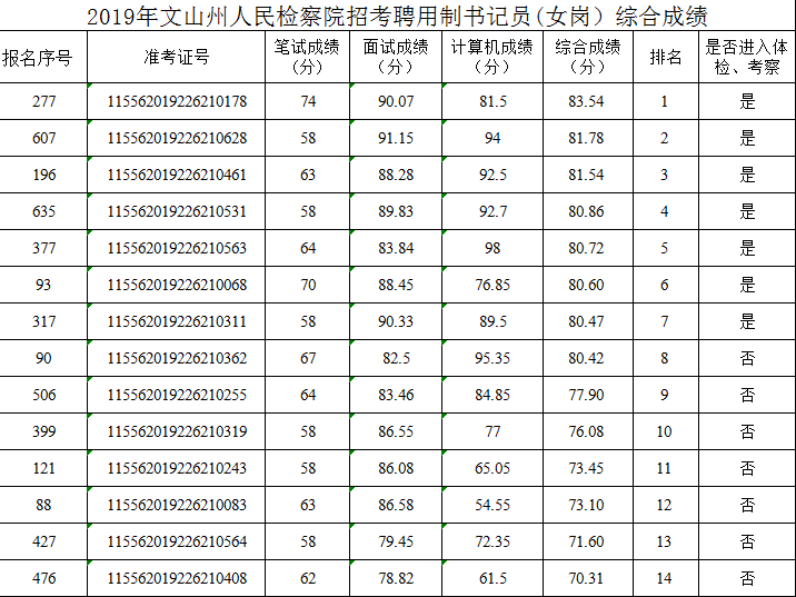 2019年文山州人民檢察院招考聘用制書記員綜合成績公告