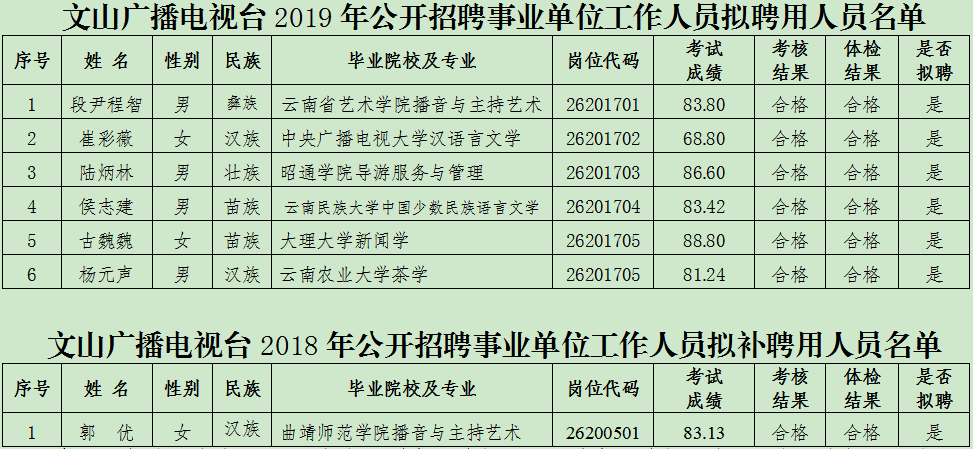 根據(jù)《2018年文山州事業(yè)單位公開(kāi)招聘工作人員通告》《2019年文山州事業(yè)單位公開(kāi)招聘工作人員通告》和《云南省事業(yè)單位公開(kāi)招聘工作人員辦法》(云人社發(fā)〔2016〕182號(hào))、《云南省事業(yè)單位公開(kāi)招聘工作人員面試測(cè)評(píng)暫行辦法》(云人社發(fā)〔2016〕405號(hào))的有關(guān)規(guī)定,經(jīng)面試考試、考察和體檢合格,現(xiàn)將文山廣播電視臺(tái)2019年公開(kāi)招聘事業(yè)單位工作人員擬聘用人員名單及2018年公開(kāi)招聘事業(yè)單位工作人員擬補(bǔ)聘用人員名單公示如下,公示時(shí)間7個(gè)工作日(2019年8月29日至2019年9月6日)。