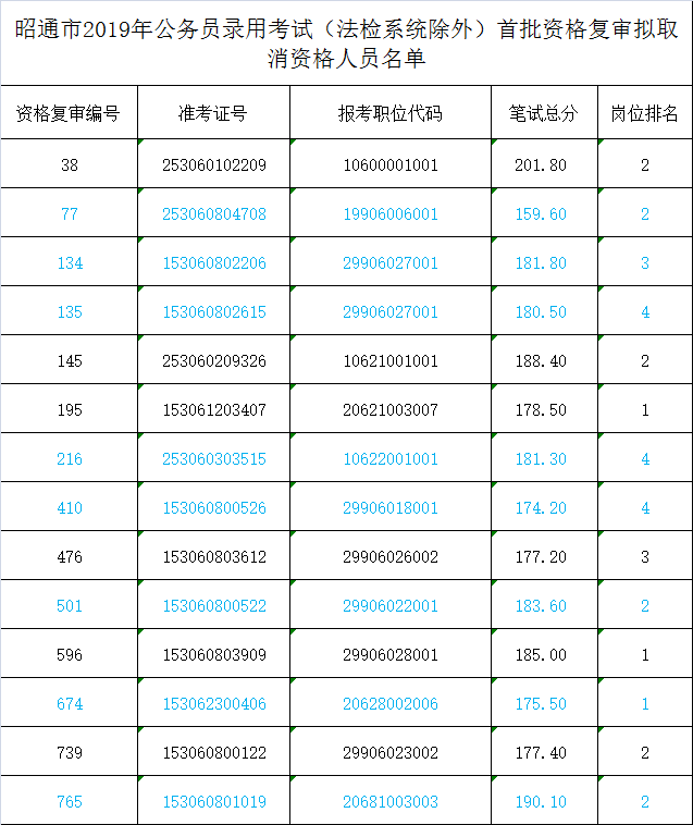2019年昭通市公務(wù)員錄用考試(法檢系統(tǒng)除外)首批資格復(fù)審擬取消資格人員名單