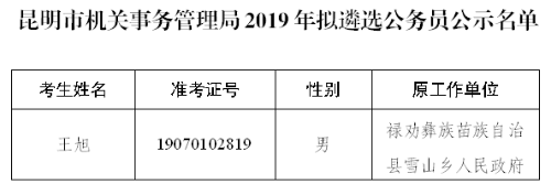 根據(jù)《昆明市2019年市級機關(guān)公開遴選公務(wù)員(參公管理人員)公告》有關(guān)規(guī)定,經(jīng)筆試、面試、考察和體檢等程序,昆明市機關(guān)事務(wù)管理局?jǐn)M遴選王旭同志,現(xiàn)進行公示。人選情況見附件。
