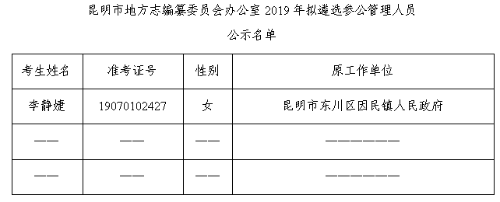 根據(jù)《昆明市2019年市級機(jī)關(guān)公開遴選公務(wù)員(參公管理人員)公告》有關(guān)規(guī)定,經(jīng)筆試、面試、考察和體檢等程序,昆明市地方志編纂委員會(huì)辦公室擬遴選李靜婕1名同志,現(xiàn)進(jìn)行公示。人選情況見附件。