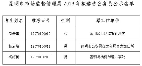 昆明市市場監(jiān)督管理局2019年擬遴選公務(wù)員人選公示
