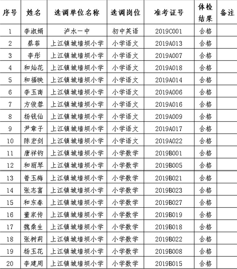 根據(jù)《中共瀘水市委辦公室瀘水市人民政府辦公室關(guān)于印發(fā)<瀘水市機關(guān)事業(yè)單位工作人員調(diào)配暫行規(guī)定(試行)>的通知》(瀘辦發(fā)〔2018〕130號)、《瀘水市2019年面向全省公開選調(diào)中學(xué)教師公告》和《瀘水市2019年面向全市公開選調(diào)小學(xué)教師公告》等有關(guān)規(guī)定,經(jīng)報名、資格審查、面試和筆試、體檢等選調(diào)程序,現(xiàn)將擬選調(diào)人員名單予以公示,公示期為5個工作日(2019年9月21日至2019年9月25日),如對公示人員有意見,可通過來信、來電、來訪等方式向瀘水市紀(jì)委市監(jiān)委派駐市教育體育局紀(jì)檢組和瀘水市教育體育局反映。