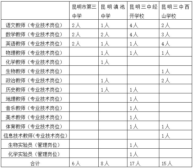 應(yīng)聘昆明市第三中學(xué)、昆明三中經(jīng)開學(xué)校、昆明三中西山學(xué)校的,請(qǐng)將材料交到昆明市第三中學(xué)教務(wù)處,由昆明市第三中學(xué)組織考核;應(yīng)聘昆明滇池中學(xué)的,請(qǐng)將材料交到昆明滇池中學(xué)辦公室,由昆明滇池中學(xué)組織考核。