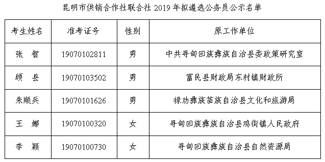 昆明市供銷合作社聯(lián)合社2019年擬遴選公務(wù)員人選公示